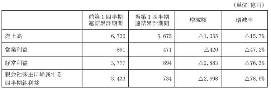 売上高は、前年同期比▲15.7%の5675億円であった。減収額▲1055億円の内訳は、物流事業で▲750億円、航空運送事業で▲255億円と、2事業の減収がダイレクトに影響した。