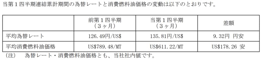 為替と燃料油価格は、前年同期比で同社事業にとって有利に推移していることが分かる。