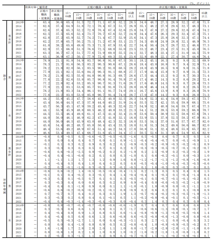 総務省統計局「労働力調査」によれば、2022年の非正規社員は36.9%で、全ての働く人の約4割と多く、この内、女性が7割を占めています。