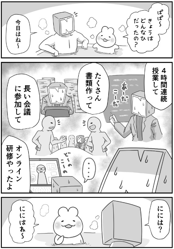 「@nonnyakonyako」さんと息子の「にに」くんは、お風呂で今日あったことをお互いに話しています。「@nonnyakonyako」さんは、書類を作って会議に参加して…などかなり忙しかった様子。対するににくんは、どんな一日だったのでしょうか?