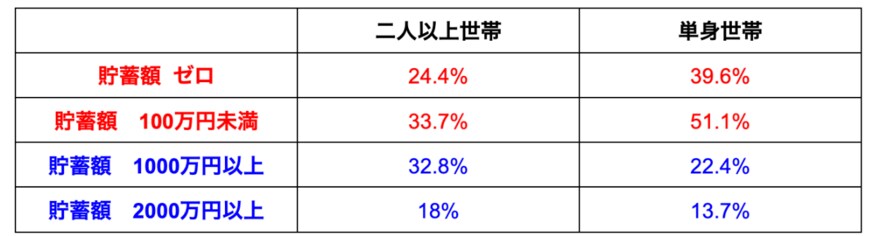 上記表をみると、貯蓄が「ある人」と「ない人」の二極化傾向にあることがわかり、特に単身世帯においては、貯蓄がない人の割合のほうが圧倒的に多い状況です。