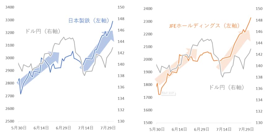 加えて、5月以降進行した円安も追い風となって、6月以降の株価は日本製鉄、JFEホールディングス両社とも堅調な推移となっていると考えられます。
