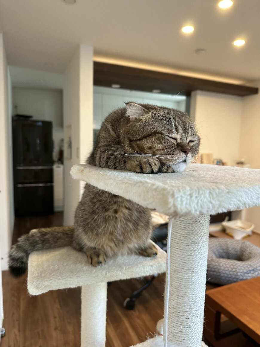 SNSでたくさんの注目を浴びているのは猫の「たぬ吉」くん。写真にはキャットタワーで休憩するたぬ吉くんの姿がおさめられていますが……?