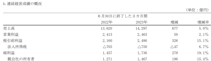 1Q親会社の所有者に帰属する純利益は、前年同期比+15.4%の1467億円となった。