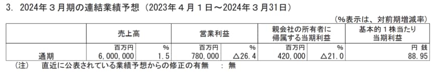 2024年3⽉期の通期連結業績予想は、2023年5⽉10⽇公表値を据え置いた。