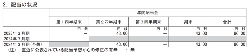 配当予想は据え置き、1株当たり年間配当額は前期と同額の86円を予想する。