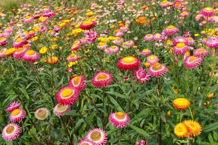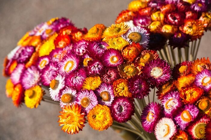 ヘリクリサムは、麦わら帽子のようなユニークな咲き姿が魅力の花。明るい色合いを中心に多彩なカラーが揃っており、花の形から「麦わら菊」という名前でも親しまれています。