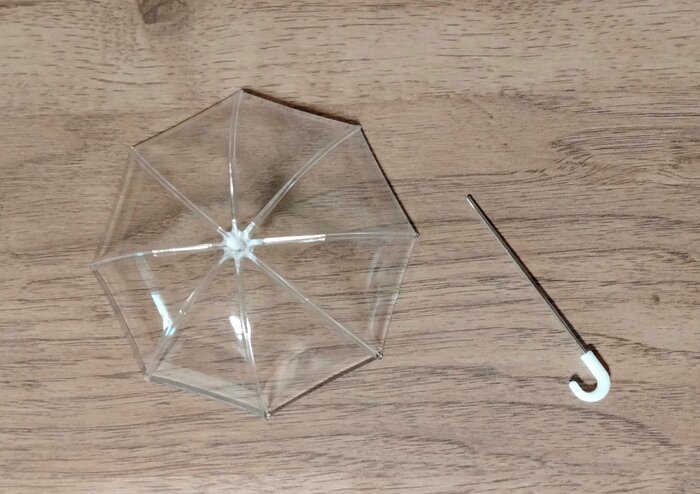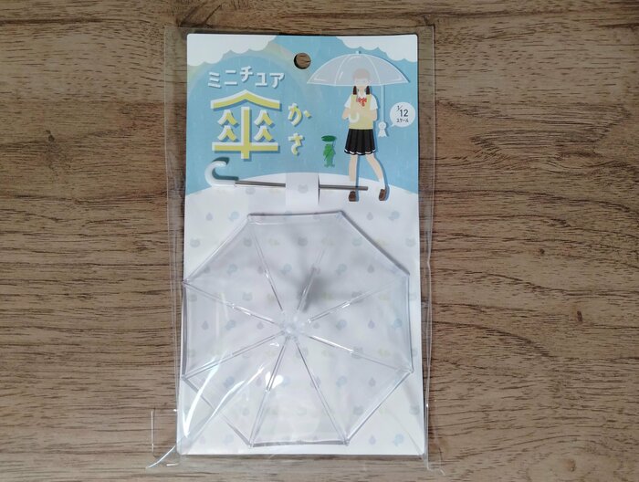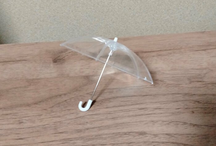 こちらがセリアで販売されている「1/12サイズのビニール傘」です。クリア仕様のビニール傘なので、男性のキャラクターにも女性のキャラクターにも似合いそうです。