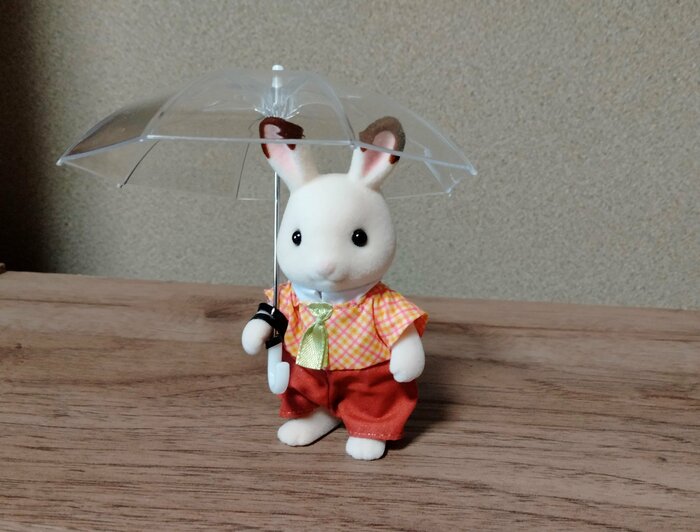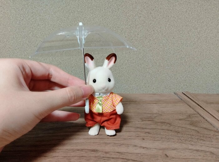 次にシルバニアファミリーの人形に傘を差し掛けてみました。写真は、ショコラウサギのお父さんです。