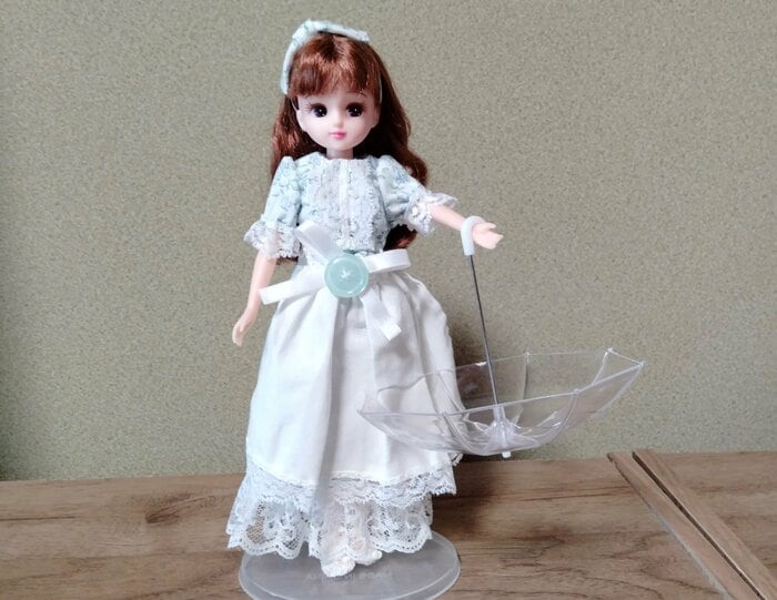 こちらの写真はリカちゃんに差し掛けた様子です。リカちゃんは約1/6サイズの人形なので、リカちゃんにはやや小さいです。