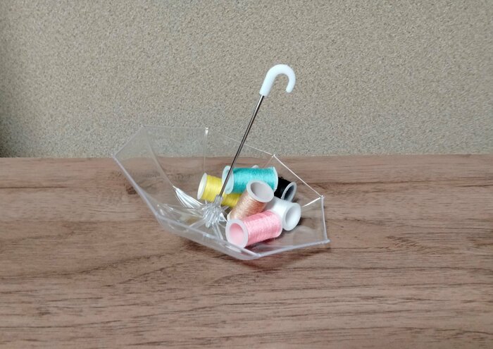 セリアの「1/12サイズのビニール傘」は、傘の部分に小物などを入れてもかわいらしいです。クリップなどを入れて、デスクの上などに置いておいても素敵です。
