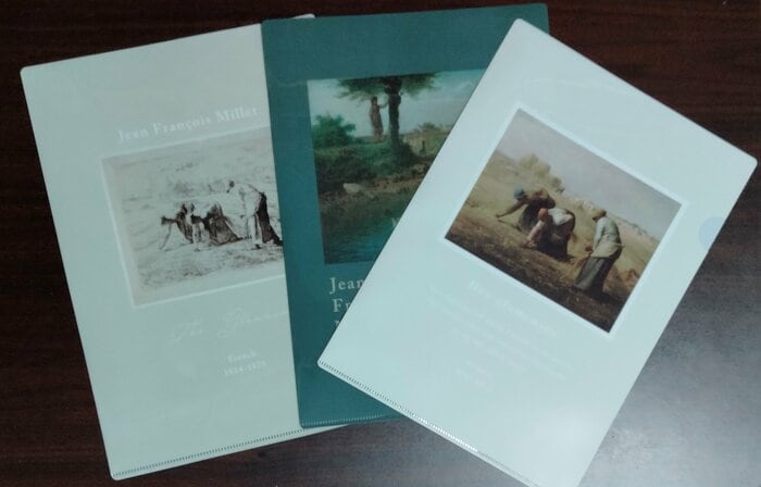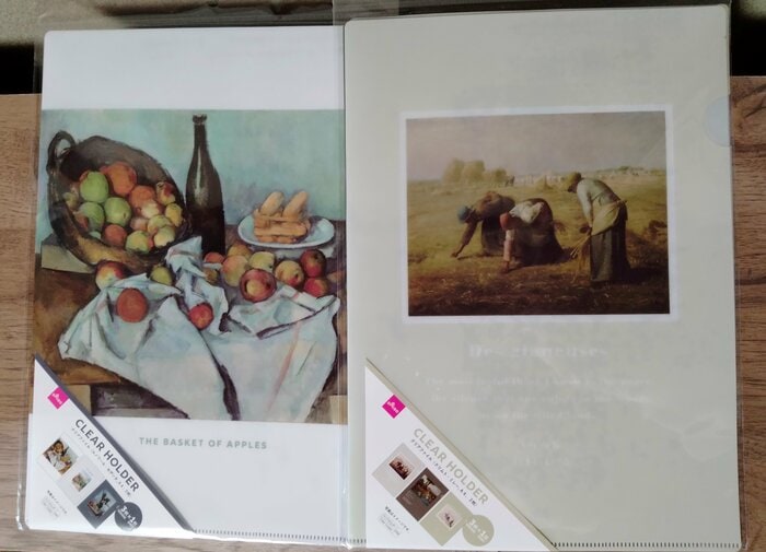 こちらがダイソーで販売されている「絵画デザインのクリアファイル」です。「クリムト・ミレー」のパッケージと「ルノワール・セザンヌ」のパッケージの2種類があります。