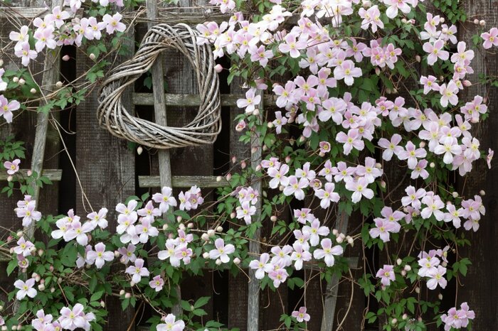 ツルの特性を生かし、フェンスやアーチ、外壁や樹木に絡ませながら育てましょう。※参考価格:500~1000円(3号ポット苗)