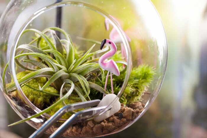 小皿やガラスケースに入れたり、動物の置物と石などと一緒にテラリウムにしたり、天井から吊るしたりなど、アイデア次第でさまざまな楽しみ方ができます。