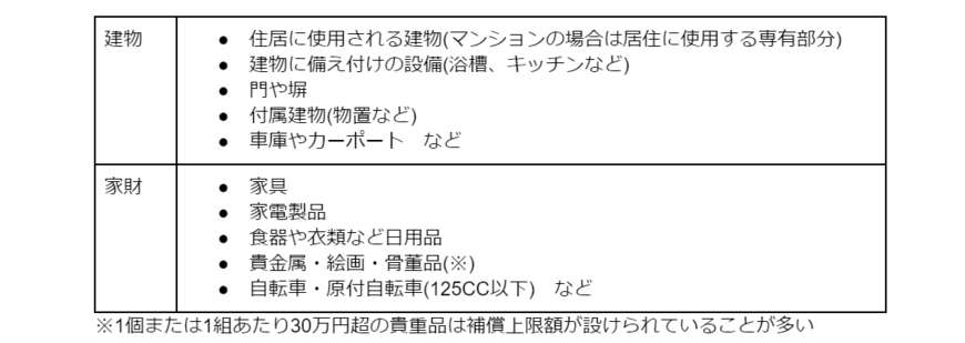 火災保険の補償対象となる「建物」と「家財」は具体的に以下のようなものが該当します。