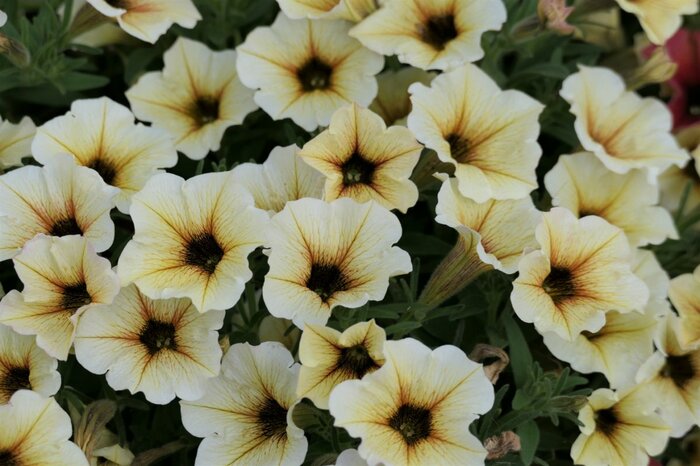 シックなカラーが続々登場中のペチュニアは、夏から秋ガーデンの主役。秋ガーデンには大人っぽい花色がオススメです。特にホワイトカラーにブラウンのスジが入る品種は、とてもオシャレですよ。