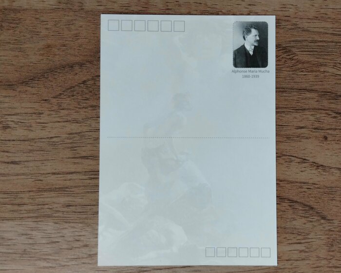 宛名を書く面もおしゃれです。切手を貼る部分には、ミュシャの肖像がデザインされています。ポストカードのサイズは14cm×10cm(筆者実測値)です。日本の私製はがきサイズなので、はがきとして問題なく活用できます。