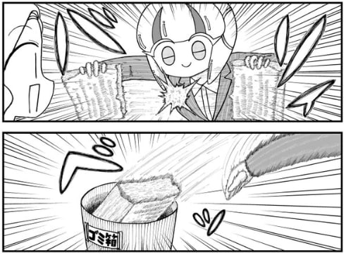 「どんな仕事も一瞬です」と自信満々に言うロボットに、会社員は大量の書類の山を渡します。果たしてロボットはどんな行動に出るのでしょうか…?
