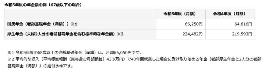 2023年1月20日、厚生労働省が、2023年(令和5年)度の年金額引き上げを公表しました。新規裁定者(67歳以下)の年金額の例は以下の通りです。