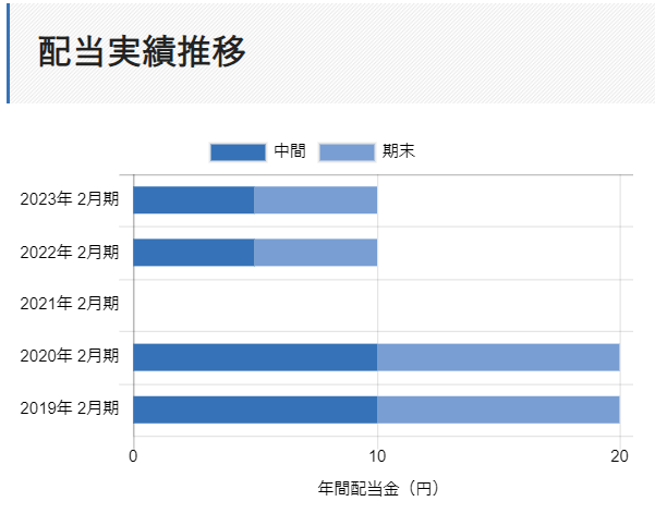 4. 吉野家の1年間の株価チャートと、配当の推移を確認
