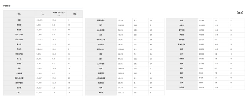 小田急電鉄株式会社のホームページに掲載されている情報をもとに駅別乗降客数の変化をみると、2022年度の駅別乗降客数は全駅で2021年度を上回りました。もっとも乗降客数が多い新宿駅では41万970人で前年比115.6%となっています。なおもっとも増加率が高かったのは東海大学前で前年比130.5%でした。(全駅の乗降人数は【表2】を参照)。