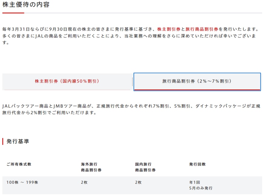 日本航空(JAL)は決算期(2023年3月期)現在、100株以上保有する方に向けて株主割引券と旅行商品割引券を提供しています。