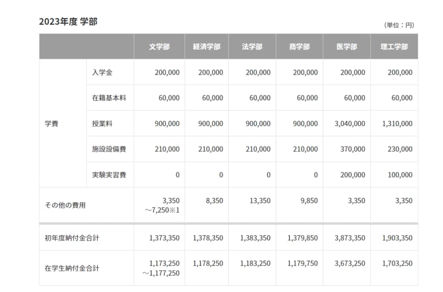たとえば早稲田大学の場合、学部の初年度にかかる費用は、以下の通りとなっています。