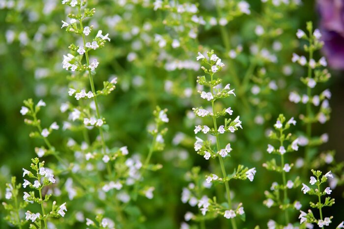 茎に小さな花がたくさん咲くカラミンサは爽やかな印象の多年草。秋まで開花するので、可憐な花を長く楽しめます。