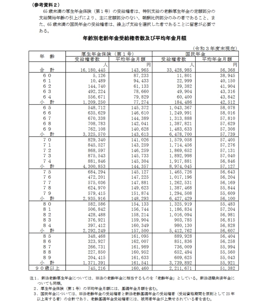 厚生労働省年金局「令和3年度厚生年金保険・国民年金事業の概況」によると、65~90歳以上が受け取る平均年金額は以下のとおりです。