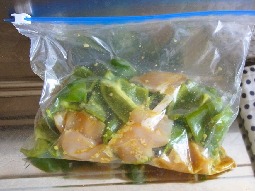 - Aをジッパー付保存袋かビニール袋に入れ、揉んで混ぜたあとに鶏むね肉を入れて揉み込み、ピーマンも入れて全体をよく混ぜ、空気を抜いて口を閉じ、冷蔵庫で保存する(1〜3日くらい)。