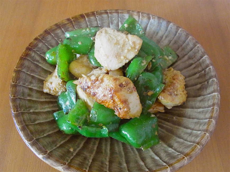 - ピーマンは半分に切って種とヘタをとり、一口大に切る。鶏むね肉は繊維と垂直にそぎ切りにする。