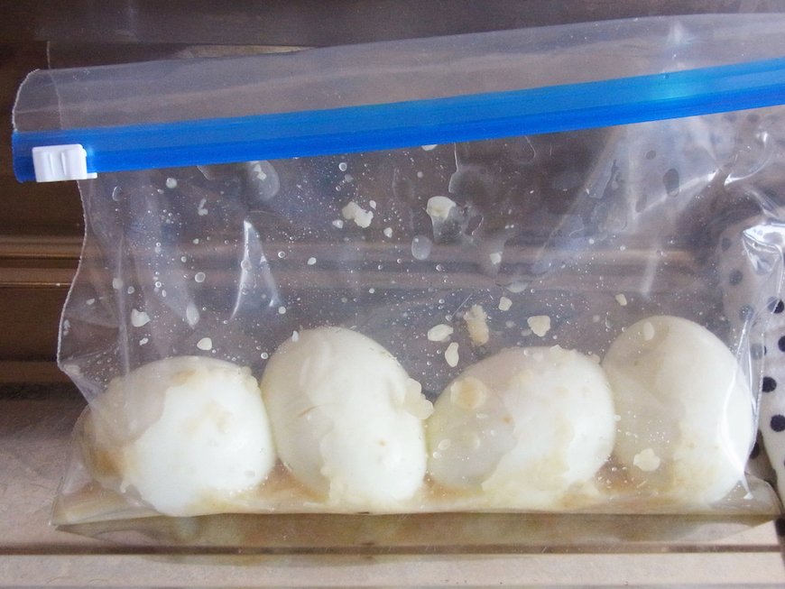 - ジッパー付保存袋かビニール袋に入れ、卵1個につき、塩麴大さじ1/2弱くらいを入れて全体にからめたら空気を抜いて口を閉じ、冷蔵庫で保存する(1日〜1週間くらい)。