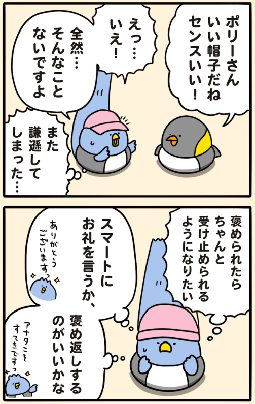 尻尾が長いオナガの「ポリー」は、被っていた帽子をペンギンに褒められるも、「そんなことないですよ…」と謙遜してしまいます。「褒められたらちゃんと受け止めたい」と思ったポリー。褒められたときの上手な切り返し方を色々と考えるのでした…。