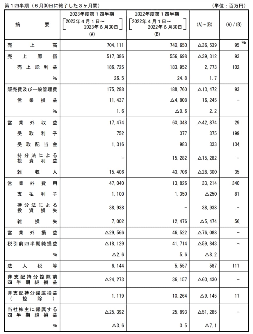 しかしながら、前述のとおり、営業外損益は前年同期から一転して295億6600万円の赤字となった。キオクシアHDに対する持分法による投資損失が、前年同期の122億円から当1Qは▲411億円と、前年同期比▲533億円となったことが要因である。
