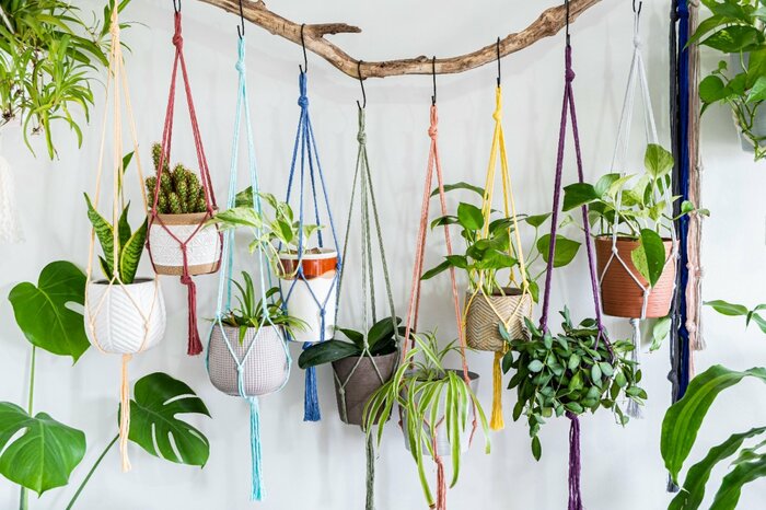 大きなサイズの鉢を置く空間がないような部屋でも、観葉植物をハンギングに仕立てればさまざまな場所に吊るして飾れます。掃除をする際に鉢植えを移動する手間を省けて楽ちんです。