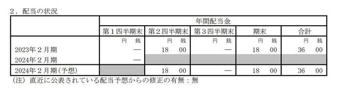 - 2024年2月期・中間配当(予想):18円