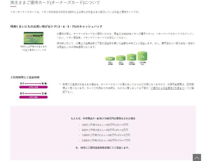 イオンは決算期(2023年2月期)現在、100株以上保有する方に向けて「株主さまご優待カード(オーナーズカード)」を年2回、提供しています。