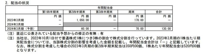 日本郵船の株式を1年前に買い、持ち続けたとすると、「2023年3月期の中間配当」と「2023年3月期の期末配当」の計2回を受け取ることができます。