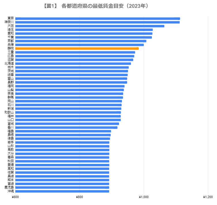 【最低賃金/2023年最新版】静岡県は何円上がるのか。全国平均は初の1000円台に 厚生労働省「令和4年度地域別最低賃金改定状況」を分析 2023.08.13 08:50 公開 執筆者大蔵 大輔 copy URL 目次[開く] 【静岡県の最低賃金】静岡県の分類は「Bランク」 【静岡県の最低賃金】全都道府県中で静岡県は第9位 【静岡県の最低賃金】過去10年の推移をチェック 【静岡県の最低賃金】住んでいる都道府県の数字をチェック 参考資料 【静岡県の最低賃金】全都道府県中で静岡県は第9位 厚生労働省が発表している静岡県の2022年の最低賃金は「944円」。2023年の最低賃金はこれに40円を加算した「984円」が目安となります。これは全都道府県の中で第9位の金額です【全都道府県のランキングは図1参照】。 出所:厚生労働省「令和4年度地域別最低賃金改定状況」をもとに筆者作成 【静岡県の最低賃金】過去10年の推移をチェック < 1 2 3 > 関連タグ #最低賃金 #厚生労働省 #時給 #静岡県 注目コンテンツ 年齢入れて5秒で見積もり!人気の医療保険ランキングをチェック[PR] 上皮内がんも対象になるがん保険。1番人気のがん保険は?[PR] 【キャラつくAI】プロフィールをもとにAIがあなたをイメージして絵を描きます![PR]