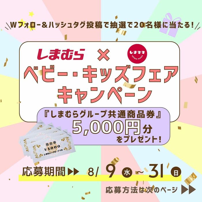 「しまむら」「しまママ」のInstagramをWフォローして、ベビー・キッズの購入品を「#しまむらベビー・キッズ」で投稿すると、「しまむらグループ共通商品券」5000円分が抽選で当たるうれしすぎるキャンペーンです。
