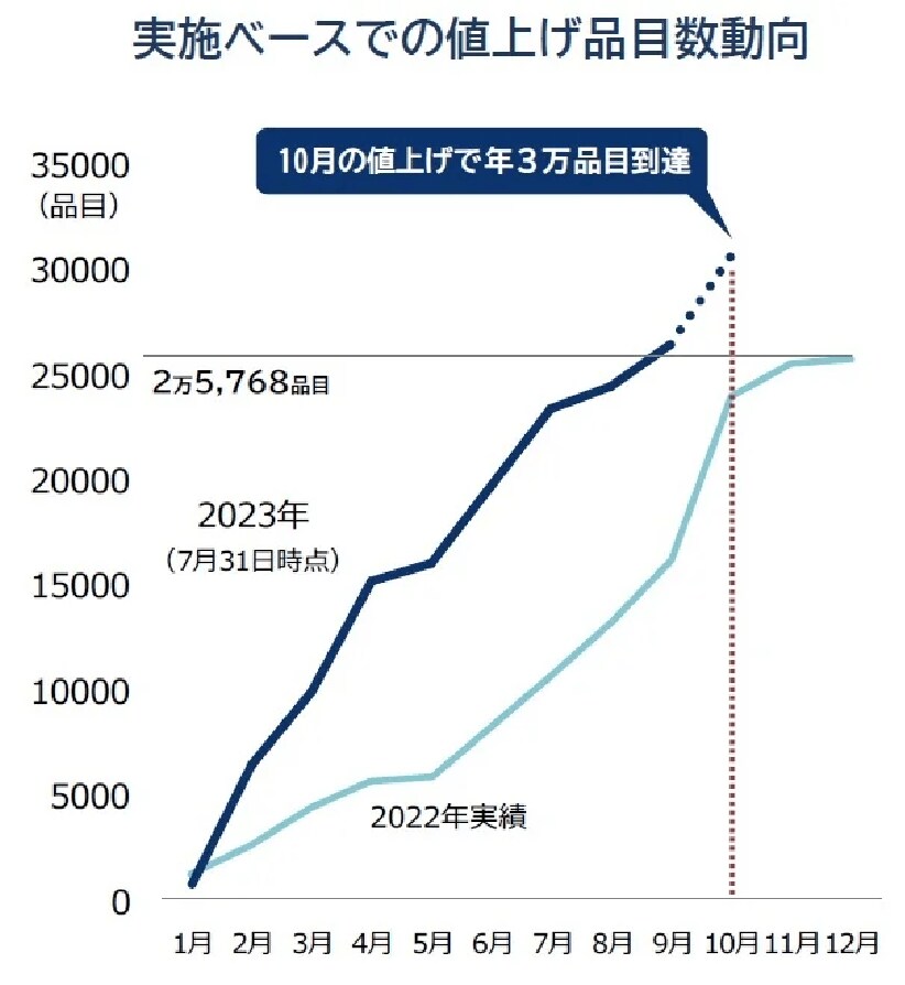 株式会社帝国データバンクの調査によると、2023年通年の値上げ品目数は累計で3万710品目となっており、2022年通年の2万5768品目をすでに上回った状態となっています(【図表2】参照)。