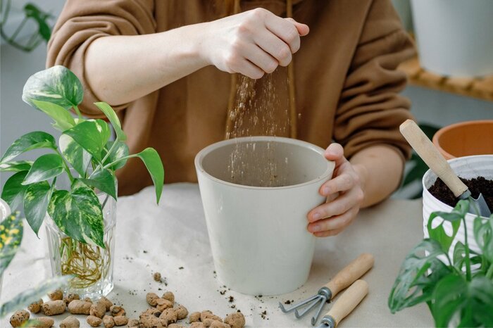 植え替えも生育期におこない、用土は肥料が入っていない赤玉土を使用します。というのも、水で育った根は非常にデリケート。いきなり肥料入りの培養土に植えてしまうと、強い刺激で弱ってしまうことがあるため注意が必要です。