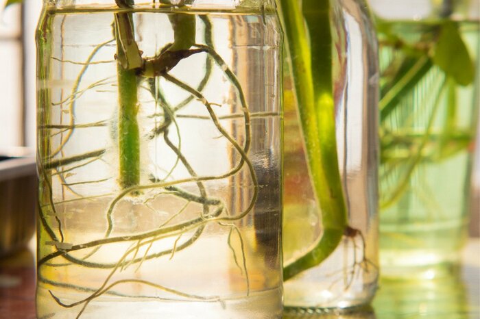 水挿しに使う容器は、発根の状態が分かりやすいようガラスなどの透明容器で管理するのがオススメ。早く根を出したいときは、市販の発根促進剤を使用しましょう。