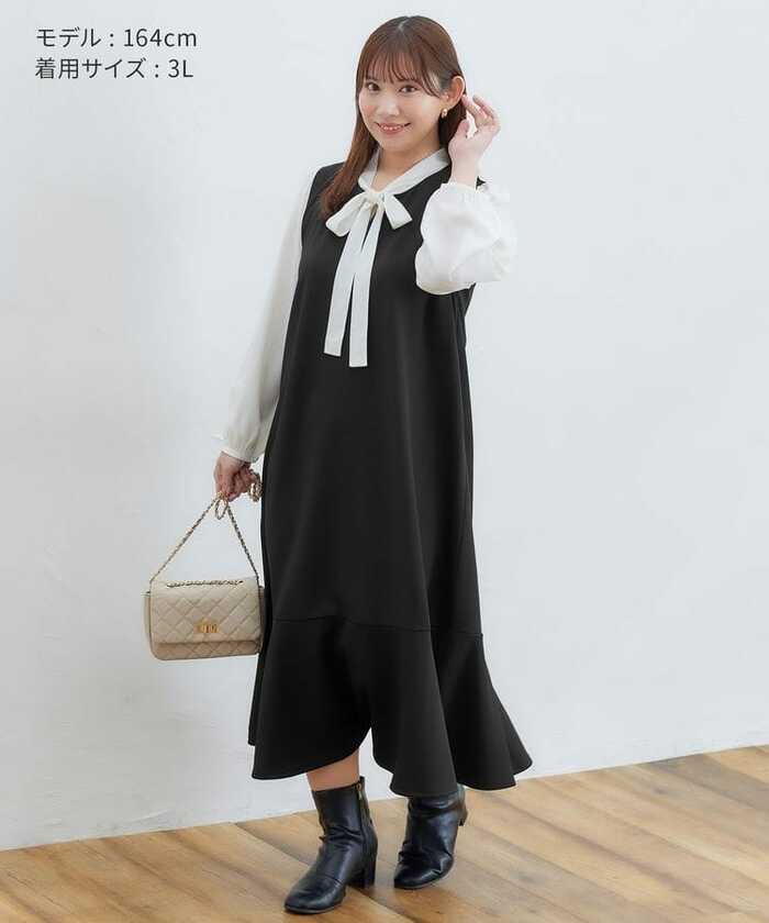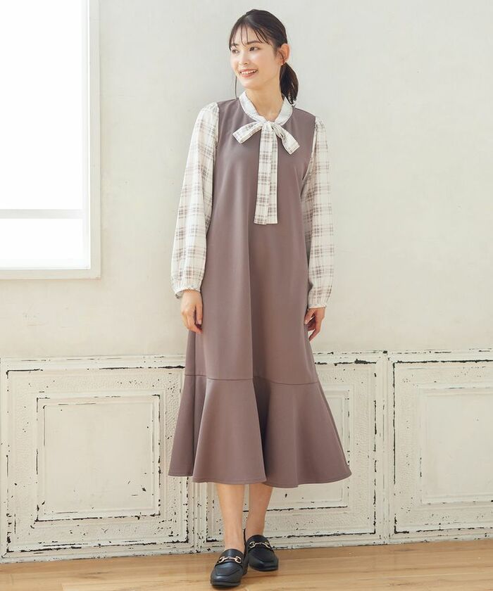 ボウタイブラウスとワンピースをレイヤードしたようなデザインの「ボウタイワンピース」です。