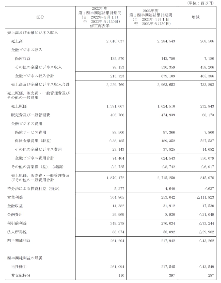 売上高は4月~6月では過去最高を更新した。一方で、営業利益および当社株主に帰属する四半期純利益はともに減収となった。