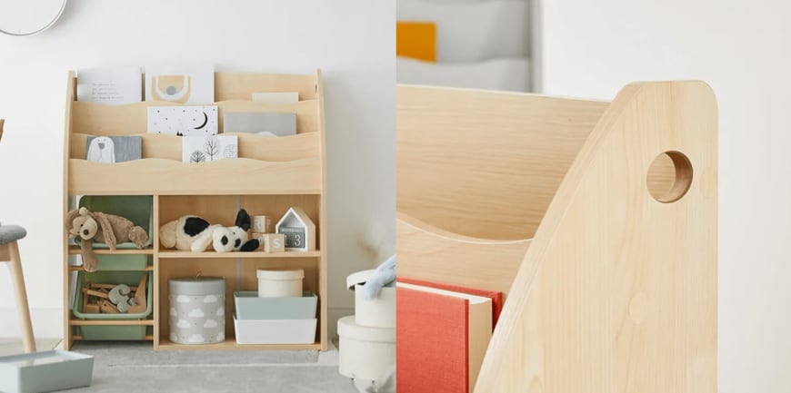 絵本をディスプレイできるラックの魅力は見た目のよさだけではありません。ユーザーからは子供が自分で本を選んだり片付けたりするのを促す効果もあると好評。また幅があるので多くの本やぬいぐるみを収納することができます。丸みのあるデザインで安全性も確保しています。