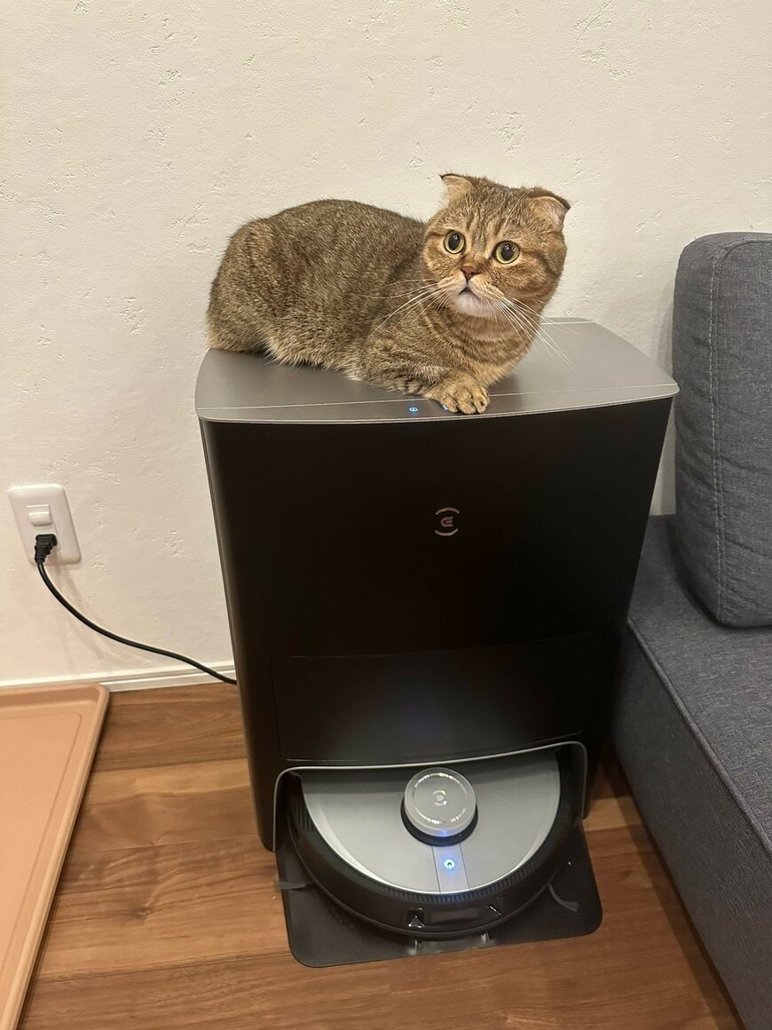 注目を浴びているのは猫の「たぬ吉」くん。写真にはお掃除ロボットの収納部分のうえで、リラックスしたように座るたぬ吉くんの姿がありました。