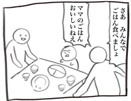 パパの「@inu_eat_inu」さんは、ママと2歳のちょーちゃんと一緒に食卓を囲んでいまいました。「ママのごはんおいしいね!」と食事を始めようとしますが、ちょーちゃんの顔はどこか浮かない様子...。