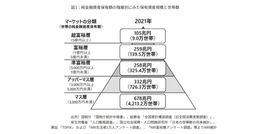 野村総合研究所「日本の富裕層は149万世帯、その純金融資産総額は364兆と推計」では、富裕層の世帯数や資産額を公表していますが、その定義は世帯が保有する金融資産(預貯金・株式・債券・投資信託・保険など)の合計額からローンなどの負債を差し引いた「純金融資産保有額」です。