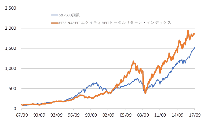 さて、これはあまり知られていないのですが、米国REITの長期リターンはS&P500を凌駕しているのです。